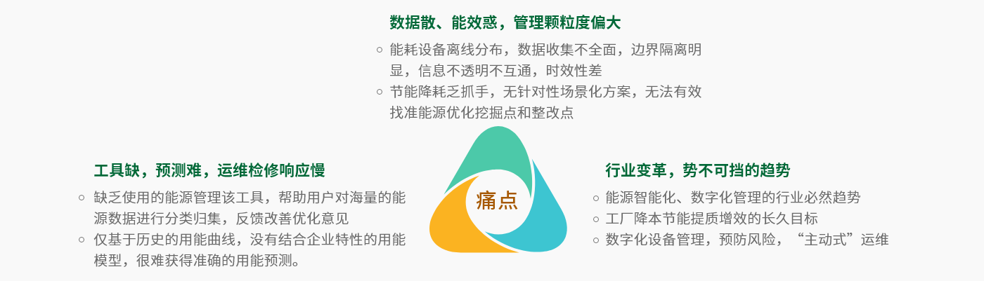 企業(yè)在生產(chǎn)運(yùn)營(yíng)過程中所用能耗大,各環(huán)節(jié)粗礦式經(jīng)營(yíng),成本居高不下,無(wú)法準(zhǔn)確定位關(guān)鍵癥結(jié)所在。工廠能源管理系統(tǒng)解決方案對(duì)企業(yè)使用的水、電、熱、蒸汽、燃?xì)獾雀黝惸芎挠?jì)量、分析,可更清晰地獲悉不同設(shè)備、車間、產(chǎn)線、消耗等方面的能耗動(dòng)態(tài)監(jiān)控和數(shù)據(jù)化管理,幫助用戶實(shí)現(xiàn)能耗統(tǒng)計(jì)分析,節(jié)能減排,避免“跑冒滴漏”現(xiàn)象,提高能源利用率,降低用戶成本,提高風(fēng)險(xiǎn)預(yù)判能力。