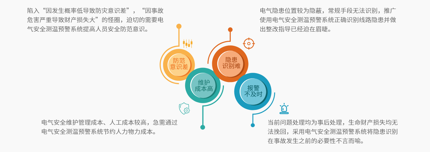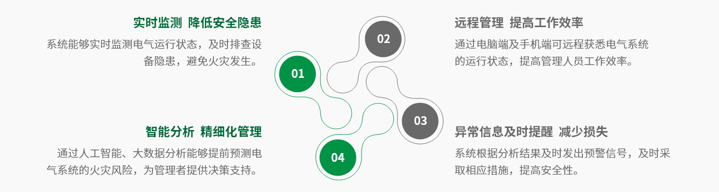 基于云計(jì)算、物聯(lián)網(wǎng)、大數(shù)據(jù)、AI、自取電、超級功耗等新一代信息技術(shù),對電氣線路和用電設(shè)備進(jìn)行不間斷的測量,輔助監(jiān)測電氣設(shè)備溫度,實(shí)時(shí)發(fā)現(xiàn)電氣線路和用電設(shè)備存在的異常啟停、安全隱患等現(xiàn)象,并對引發(fā)電氣火災(zāi)隱患進(jìn)行預(yù)警、分析,一旦發(fā)現(xiàn)異常,可即時(shí)向安全管理人員發(fā)送預(yù)警信息,指導(dǎo)其開展隱患治理,達(dá)到消除潛在的消防安全危險(xiǎn),實(shí)現(xiàn)“防患于未然”的目的。